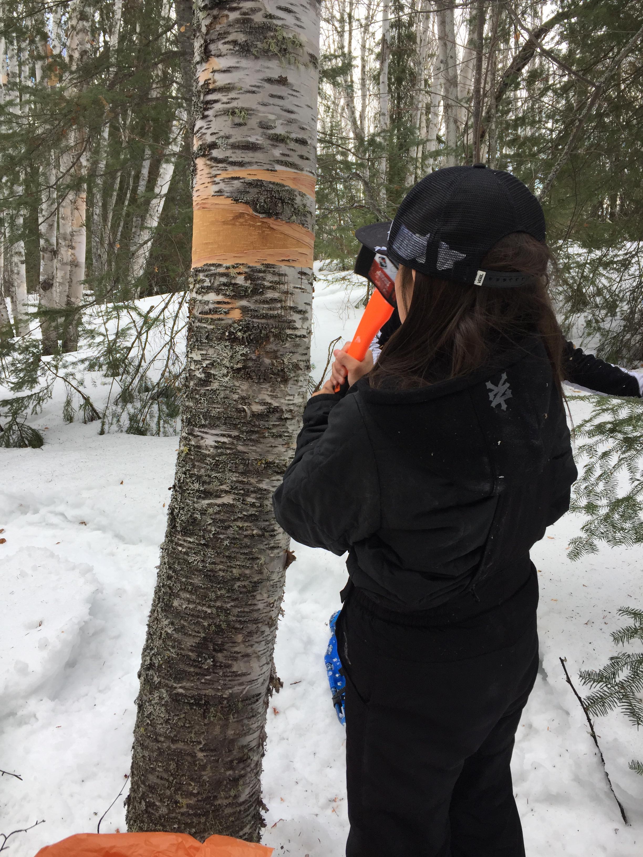Kids learn how to collect birch bark.